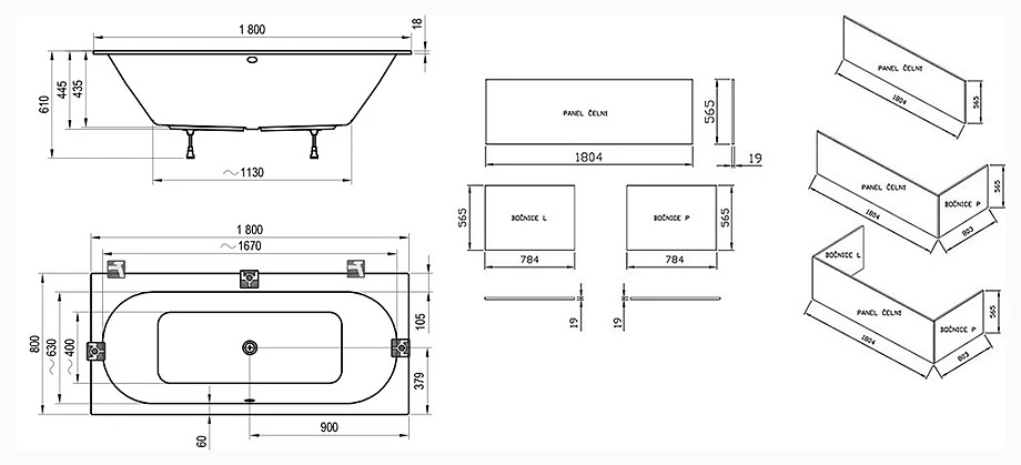 К ванне можно приобрести переднюю и боковую панели белого цвета или цвета дерева (орех, дуб, сатин)