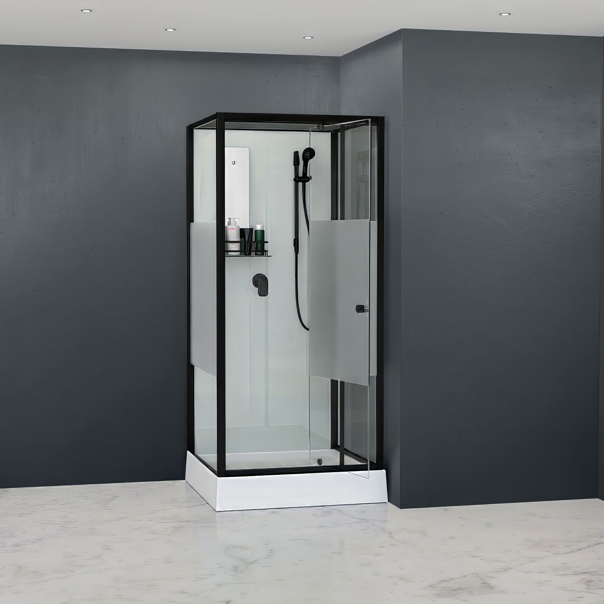 Распашная дверь кабинки обладает ручкой кноб, у двери плавный ход и полная герметичность. На стекло одет магнит, он герметизирует кабину со стороны входа.