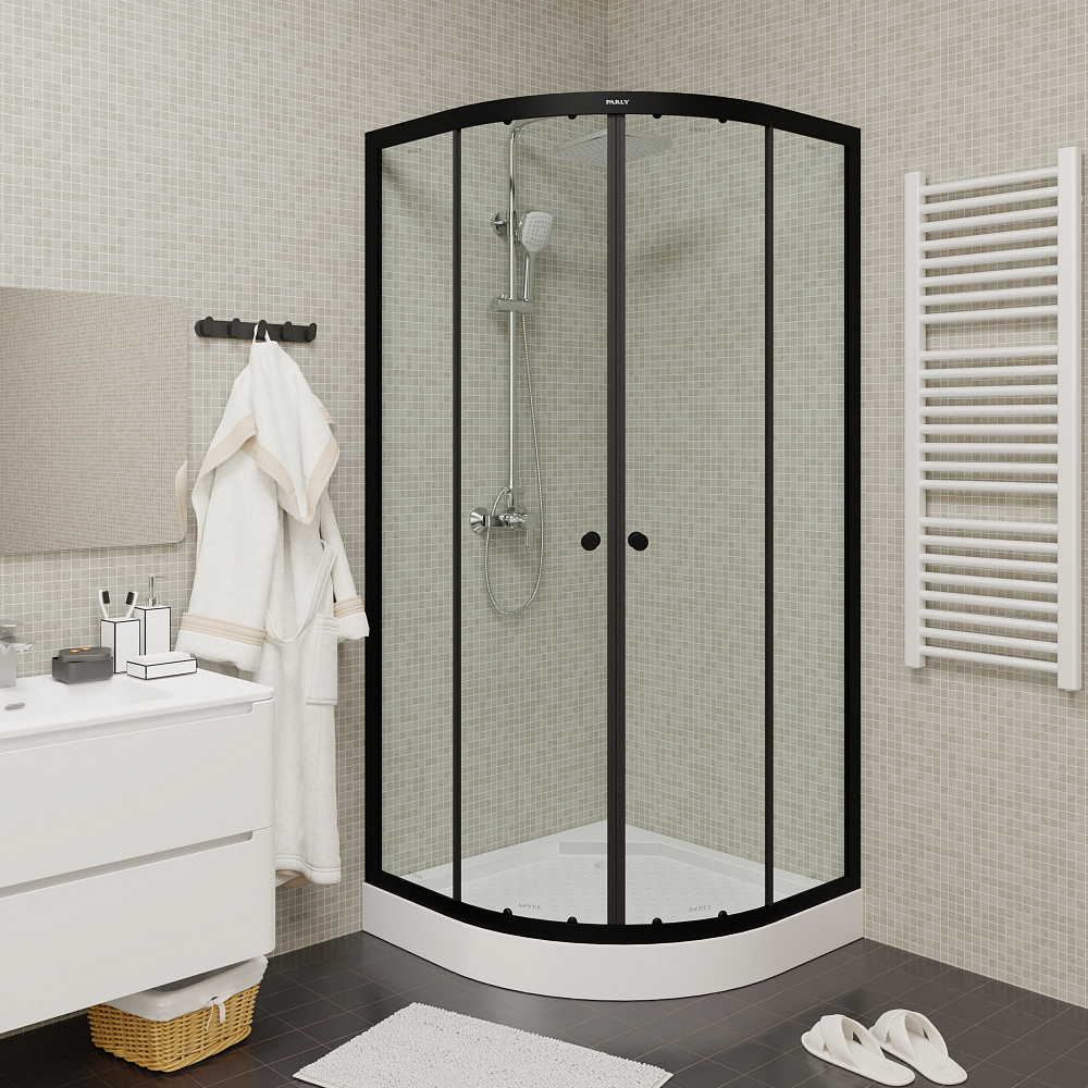 Сочетание черного профиля и прозрачного стекла отлично впишется в современную ванную комнату. Уголок полукруглой формы с раздвижными дверями экономит полезную площадь в санузле.