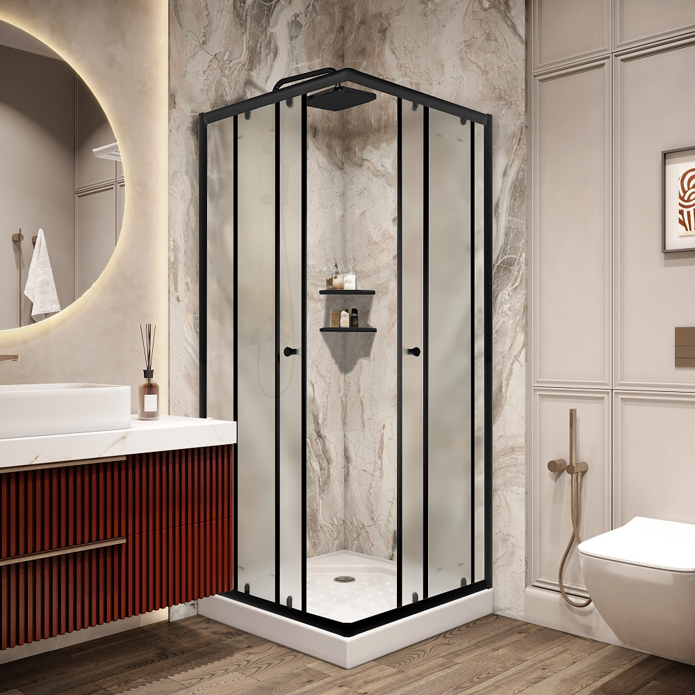 Стильный уголок дополнит современное оформление ванной комнаты. Матовое стекло не боится перепадов температуры и влажности, поэтому модель не теряет эстетики на протяжении всего пользования.