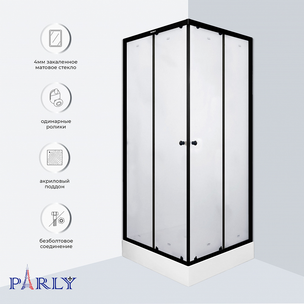 Компактная стильная модель с угловым входом. Прямые черные линии в сочетании с матовым стеклом подчеркивают современный дизайн. Раздвижные двери на одинарных роликах ходят плавно, не соскакивают с направляющих.