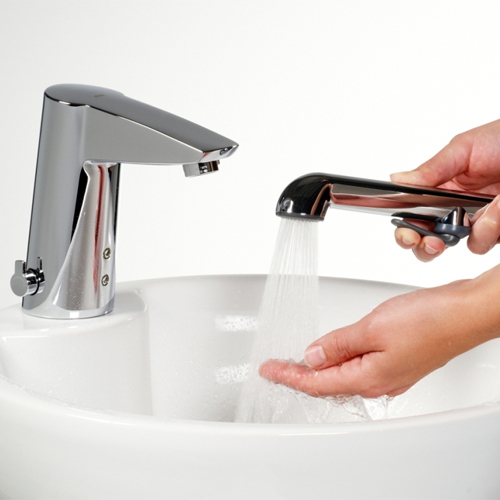 Бесконтактный смеситель для умывальника с рукояткой регулировки температуры и гигиеническим душем. Работает от батареи 6 В. Смеситель оснащён грязевыми фильтрами и обратными клапанами.