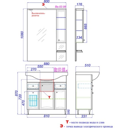 Зеркало со шкафчиком и подсветкой, арт. Ba.02.10 Тумба под умывальник с 2 ящиками и корзиной, арт. BA0108K
