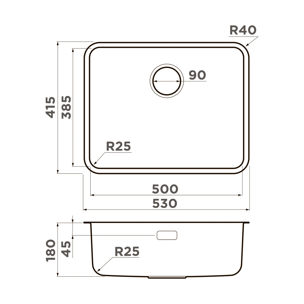 РАЗМЕРЫширина 530 ммxдлина 415 ммxглубина 179 мм РАЗМЕРЫ ЧАШИширина 500 ммxдлина 385 мм ВРЕЗНОЙ МОНТАЖ