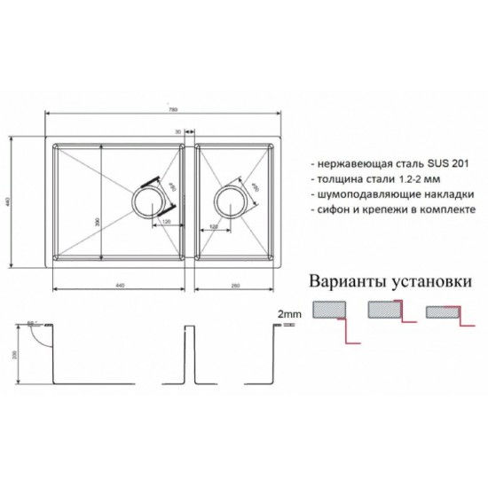 Новая серия кухонных моек- Zorg Light 1. Верхняя платформа выполнена из нержавеющей стали SUS201 толщиною 2 мм, что позволяет мойке идеально ложиться на поверхность столешницы и иметь более эстетичный внешний вид без загибов кромки 2. Чаша мойки выполнена из нержавеющей стали SUS201 толщиною 1,2 мм, что делает её достаточно прочной с хорошим шумоподавлением. 3. Скругленные внешние углы также придают мойке более эстетичный внешний вид и облегчают уход за поверхностью столешницы в районе углов мойки. Комплектация Zorg ZL R-780-2-440 Bronze Мойка, сифон, комплект крепежа Материалы для скачивания.
