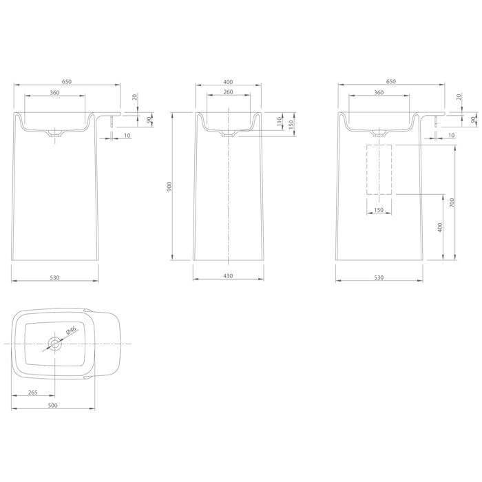 Раковина свободностоящая 67х43х90 см, выход в стену. цвет белый матовый