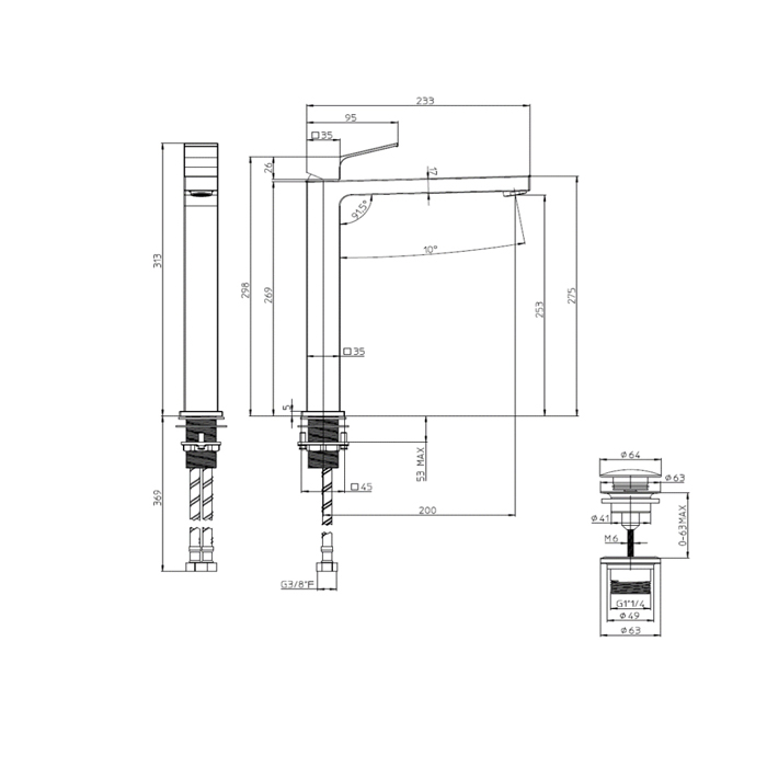 Смеситель Bossini Aki Line для раковины AKI-T высокий с донным клапаном