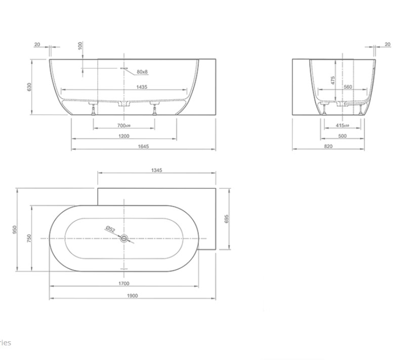 Ванна отдельностоящая правая ,из материала Stone 190х95х63 см, перелив щелевой, в правый угол, цвет белый матовый